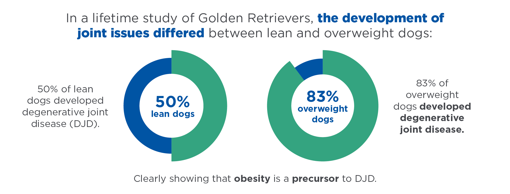 1 2019 Banfield Study. 2 2018 Pet Obesity Study. Association for Pet Obesity Prevention (USA). 3 Toll PW, Yamka RM, Schoenherr WD, et al. Obesity. In: Hand MS, Thatcher CD, Remillard RL, et al., eds. Small Animal Clinical Nutrition, 5th ed. Topeka, KS: Mark Morris Institute; 2010:501-542. Reference: Kealy RD, Lawler DF, Ballam JM, et al. Evaluation of the effect of limited food consumption on radiographic evidence of osteoarthritis in dogs. J Am Vet Med Assoc 2000; 217:1678-1680.